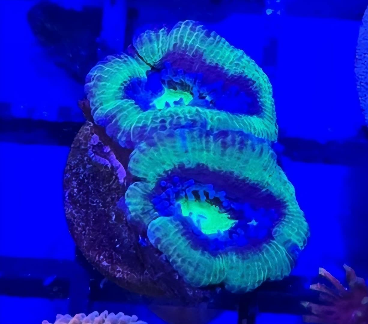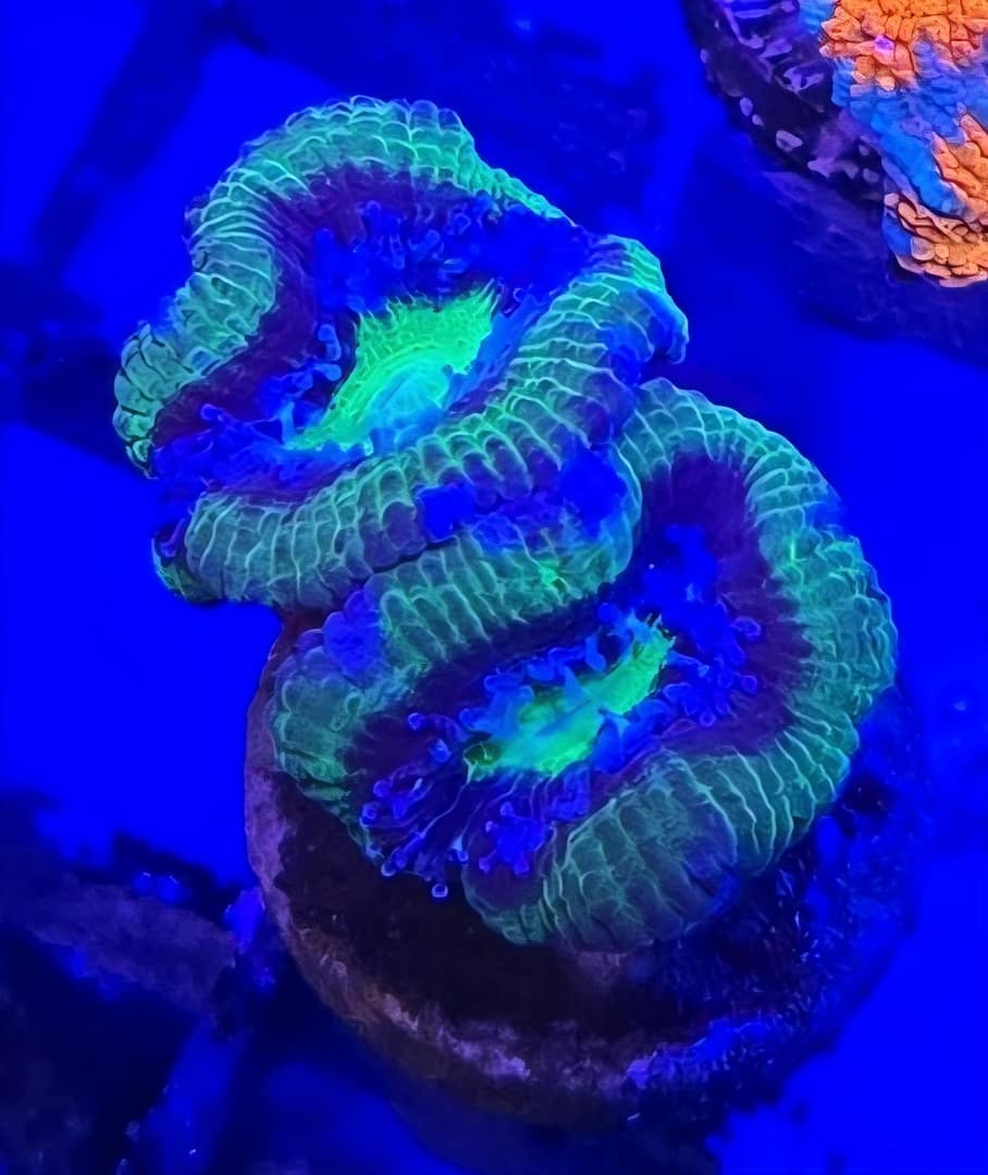 The Green and Blue Acan (now scientifically classified as Micromussa lordhowensis) is often called the “marshmallow” of the reef tank. Acans are famous for their incredibly puffy, fleshy polyps that completely hide their underlying stony skeleton. The Green and Blue morph is a cooling, aquatic masterpiece—usually featuring “minty” or “neon” green centers surrounded by rings of royal blue, teal, or slate gray. Because they are peaceful and stay low to the ground, they are the primary choice for creating a “Zoa-style” garden made of fleshy LPS corals.