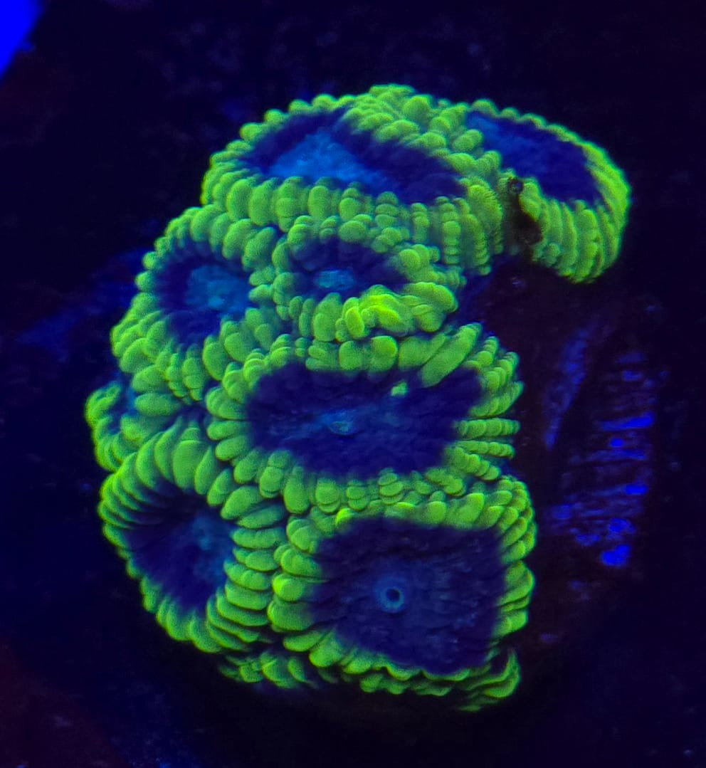 Favia coral is a beautiful type of Large Polyp Stony (LPS) coral known for its distinct “honeycomb” or “brain” appearance. These corals are popular among reef keepers because they are incredibly hardy and add striking geometric patterns to the rockwork. Green and Black Favias provide a bold, dark contrast that makes the neon greens of the coral really pop under actinic lighting. While they grow slowly, they are long-lived and rewarding additions to a mature reef tank.