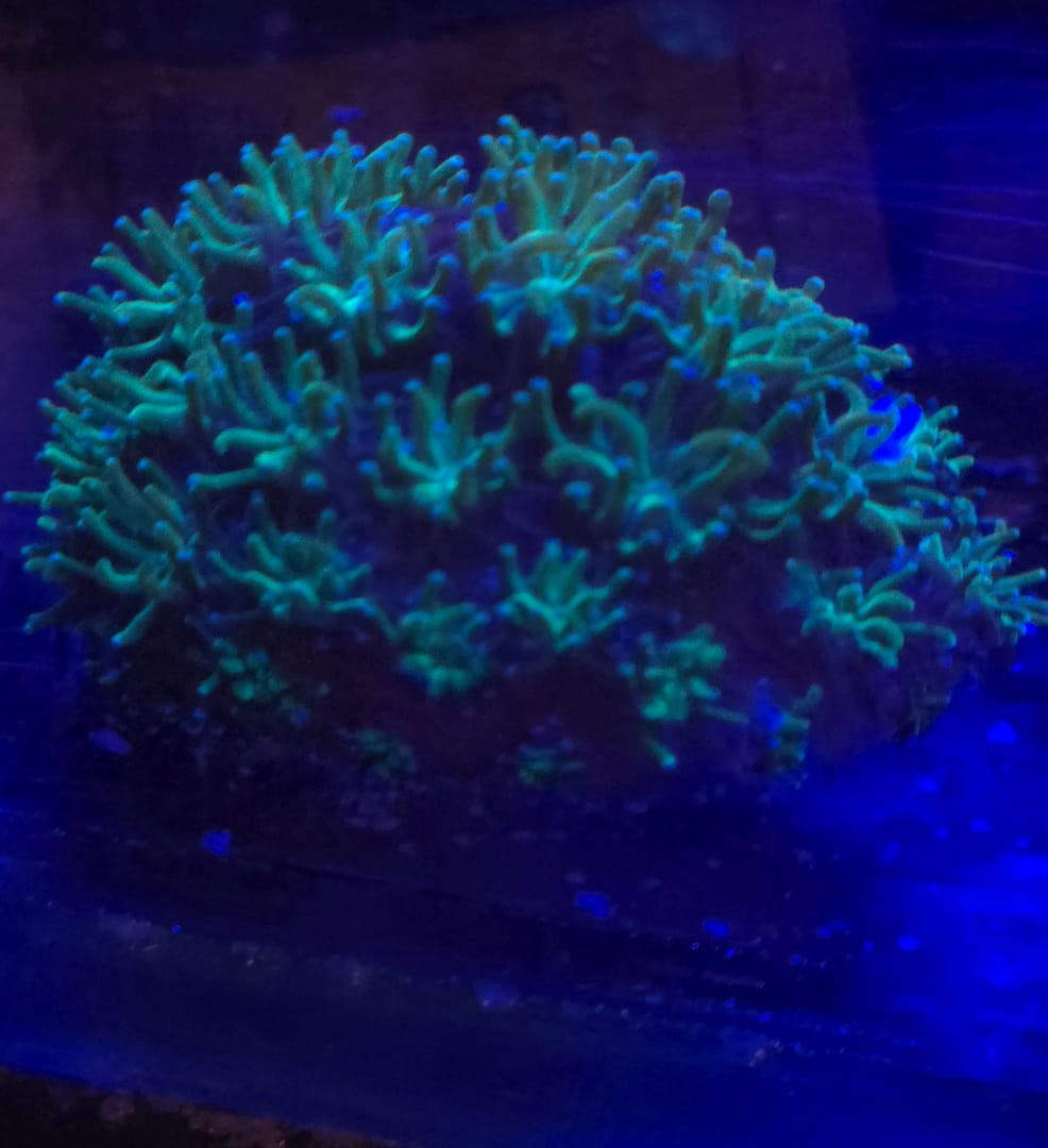 The Sonic the Hedgehog Galaxea is a high-end designer morph of the classic Galaxea fascicularis. It earns its name from its incredible, “super-sonic” neon blue and electric green coloration. Unlike the standard brown or dull green Galaxea, this variety glows intensely under actinic lighting, with polyps that look like tiny, shimmering stars.