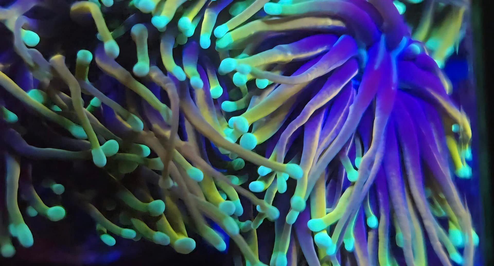 Coloration: Gold to orange tentacles with deep purple/black bases and vibrant green tips