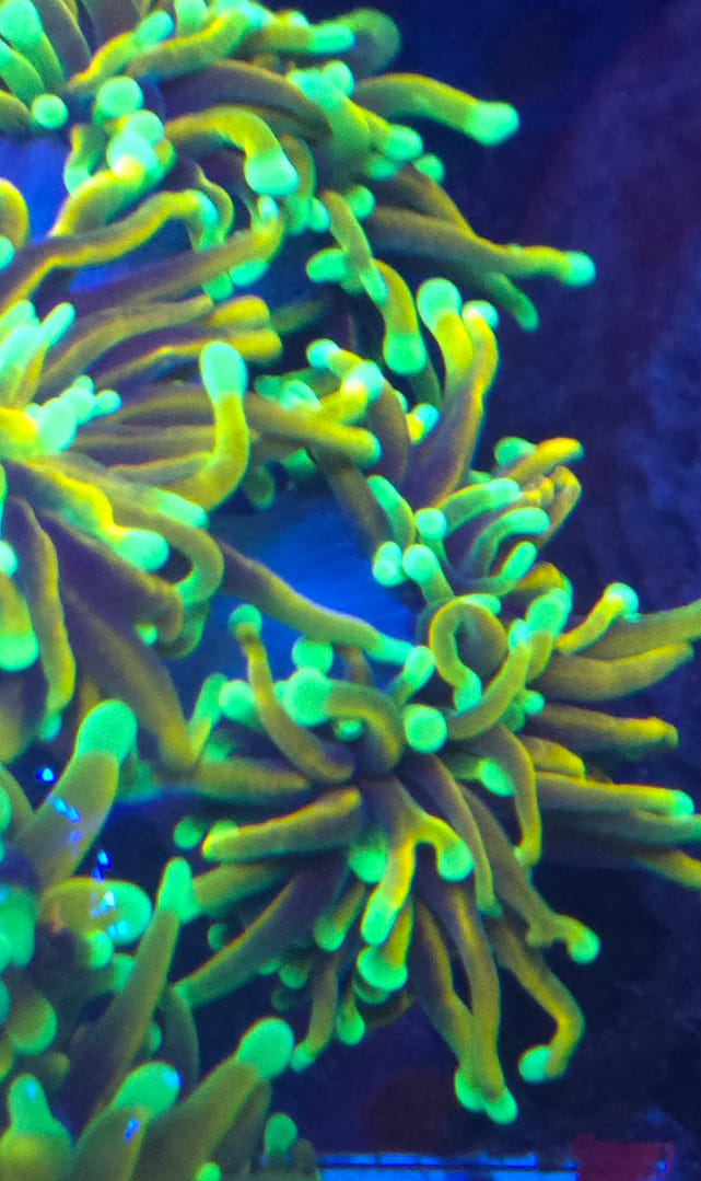 Hellfire Torch Coral (Euphyllia glabrescens) is a premier “holy grail” variety that commands attention with its high-contrast, fiery coloration. This Indonesian-origin torch is famous for its deep purple or black tentacles that transition into a blazing metallic gold or orange, often finished with brilliant neon green or teal tips. The movement of a Hellfire Torch is unmatched; its long, flowing polyps create a hypnotic flickering effect in the water column that resembles a burning flame. Because of its intense fluorescence and rarity, it is considered a centerpiece specimen for advanced reef collectors.