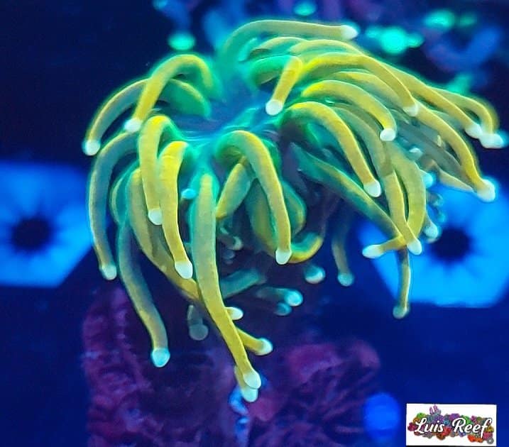 This coral exhibits moderate aggressiveness typical of Torch corals and requires ample space from neighboring corals to avoid stinging and competition damage.
