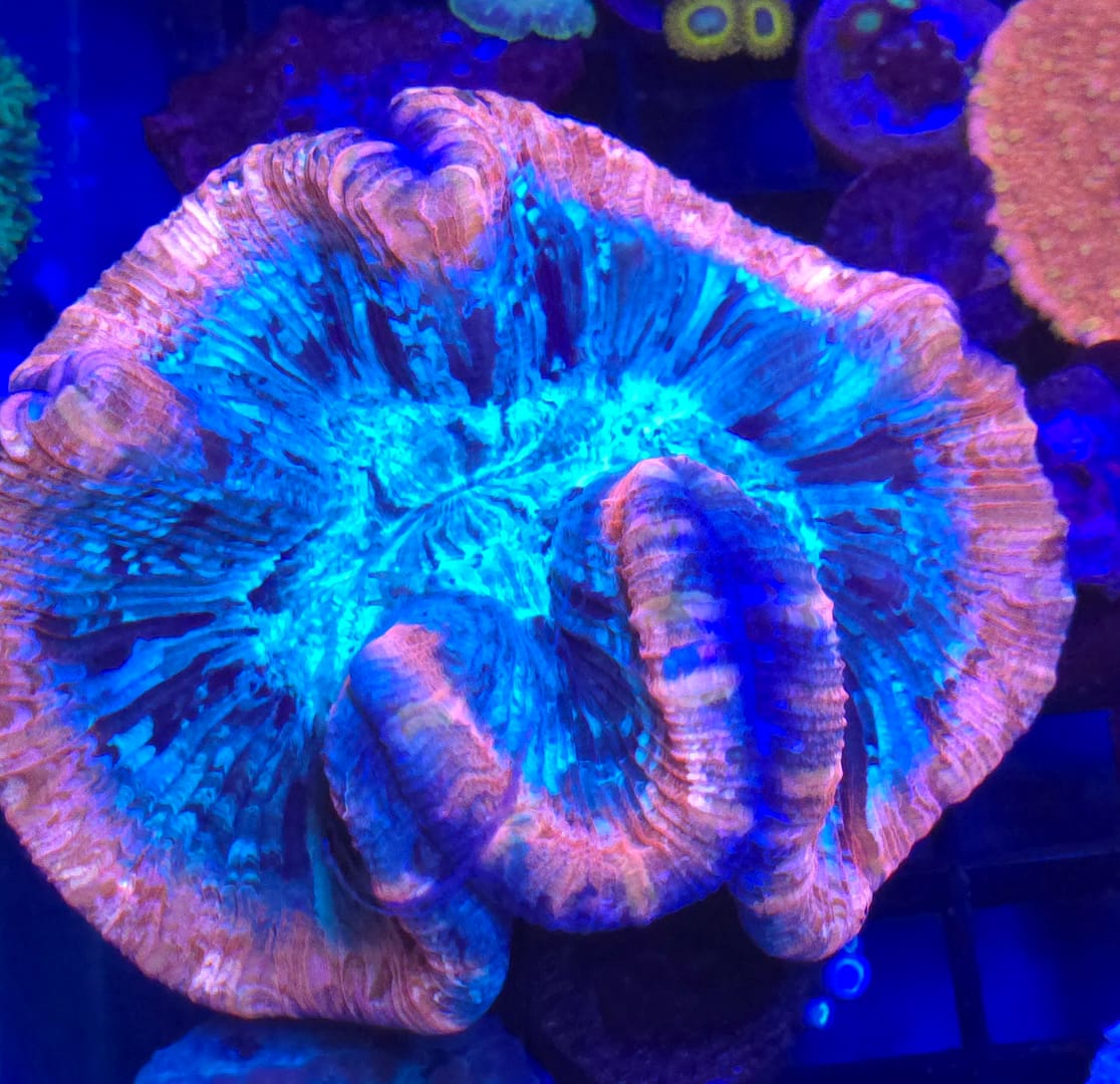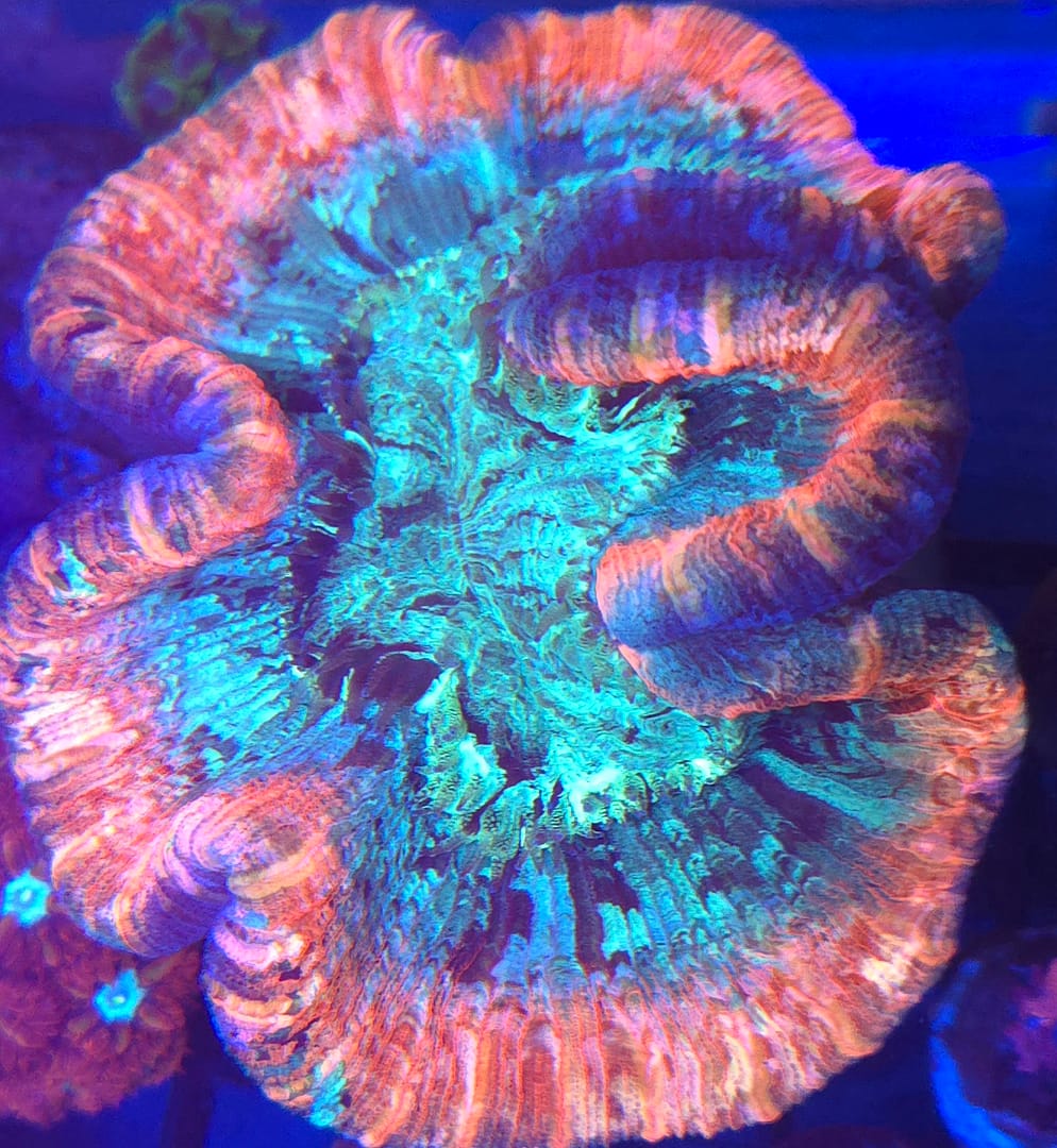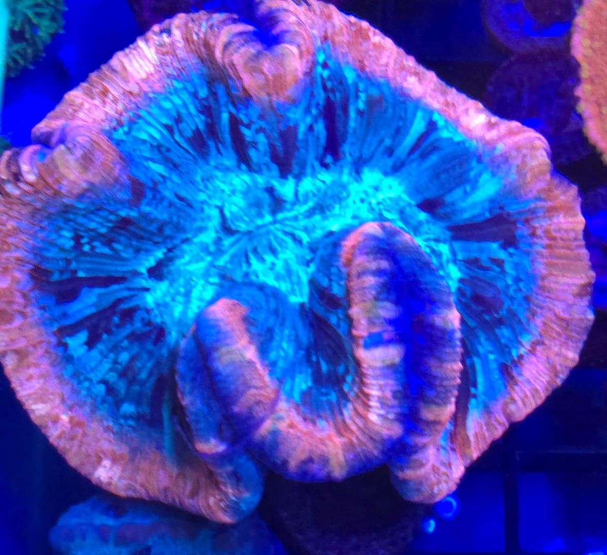 The Welsophyllia (often referred to as the Folded Brain Coral or Trachyphyllia) is the ultimate “showpiece” of the sand bed. While taxonomically merged with Trachyphyllia geoffroyi, the name “Welsophyllia” is still used in the hobby to describe specimens with a more symmetrical, circular, and deeply folded “brain” shape. They are famous for their neon-metallic colors and their incredible ability to “puff up” to nearly triple their skeletal size.