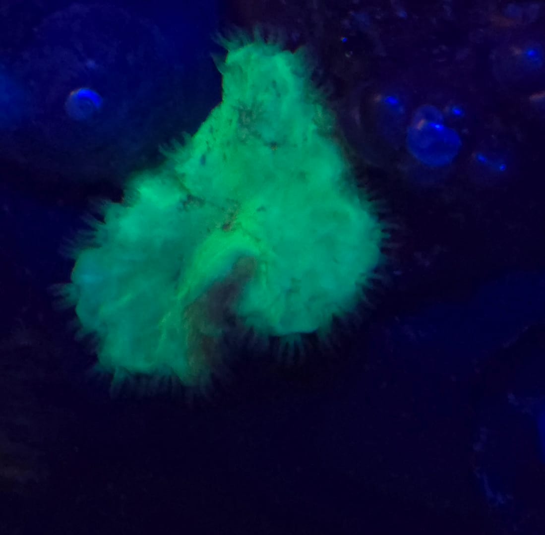 Its coloration typically ranges from a subtle mint green to a vibrant neon, often developing a beautiful fluorescent “sheen” under high-actinic lighting.