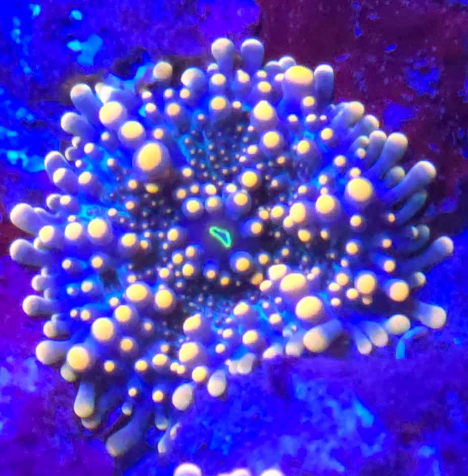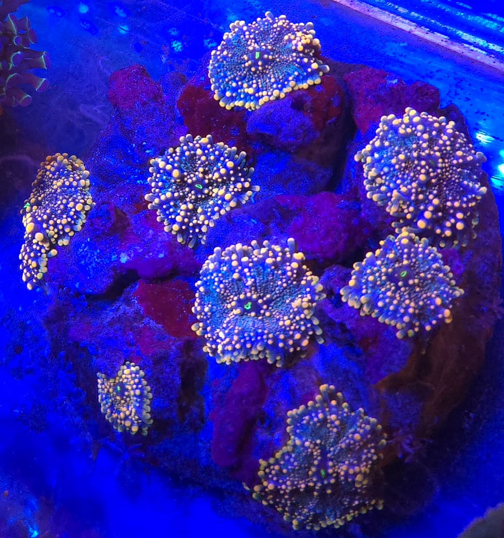 Ricordea yuma, or simply the Yuma Mushroom, is a standout species of corallimorph prized for its intricate, bead-like tentacles and incredible color diversity. Originating from the Indo-Pacific, Yumas are distinguished from their Atlantic cousins (Ricordea florida) by their larger size and the presence of tentacles covering the entire oral disc, including the area immediately surrounding the mouth. They are true showstoppers in a reef tank, often displaying wild, psychedelic color combinations. While they are slightly more sensitive to water quality and lighting changes than other mushrooms, their striking appearance makes them a rewarding challenge for any enthusiast.