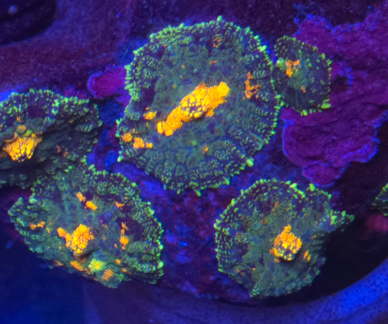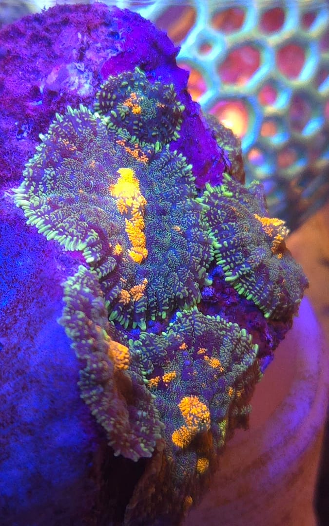 These unique, inflated growths develop as the coral matures, creating a 3D texture that looks almost otherworldly. A true “Bounce” is a conversation piece, prized for its extreme fluorescence and the way its bubbles catch the light. Because they are the result of specific mutations or environmental responses in certain Rhodactis specimens, no two are exactly alike, making each one a unique piece of living art for your reef.