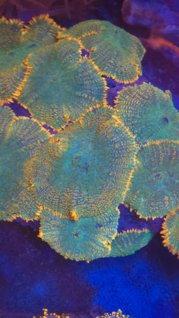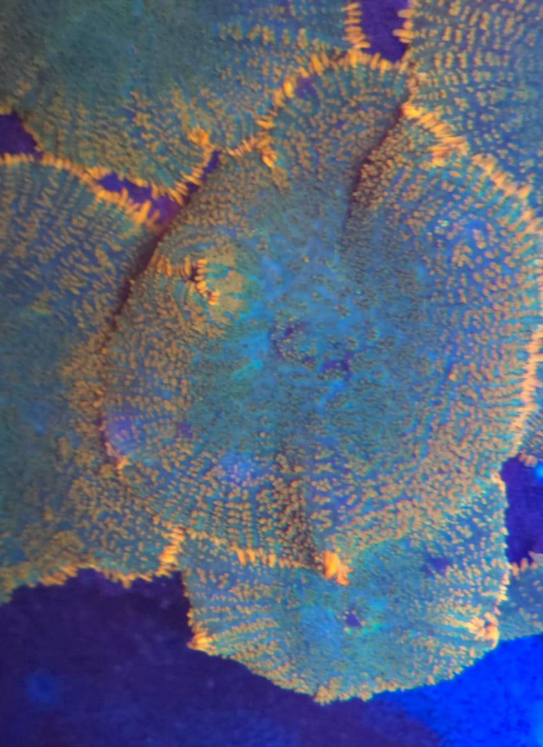The Tequila Sunrise Rhodactis Mushroom is a vibrant, high-contrast variety that brings a “tropical sunset” aesthetic to the reef. It is easily identified by its electric orange and yellow highlights over a deep red or teal base. Like other Rhodactis, it features a textured, shaggy surface with “hairy” pseudotentacles that glow intensely under blue LED lighting. This mushroom is highly prized by both beginners and advanced collectors because it offers a “bounce-like” color palette without the extreme price tag or sensitivity of a true Bounce mushroom.
