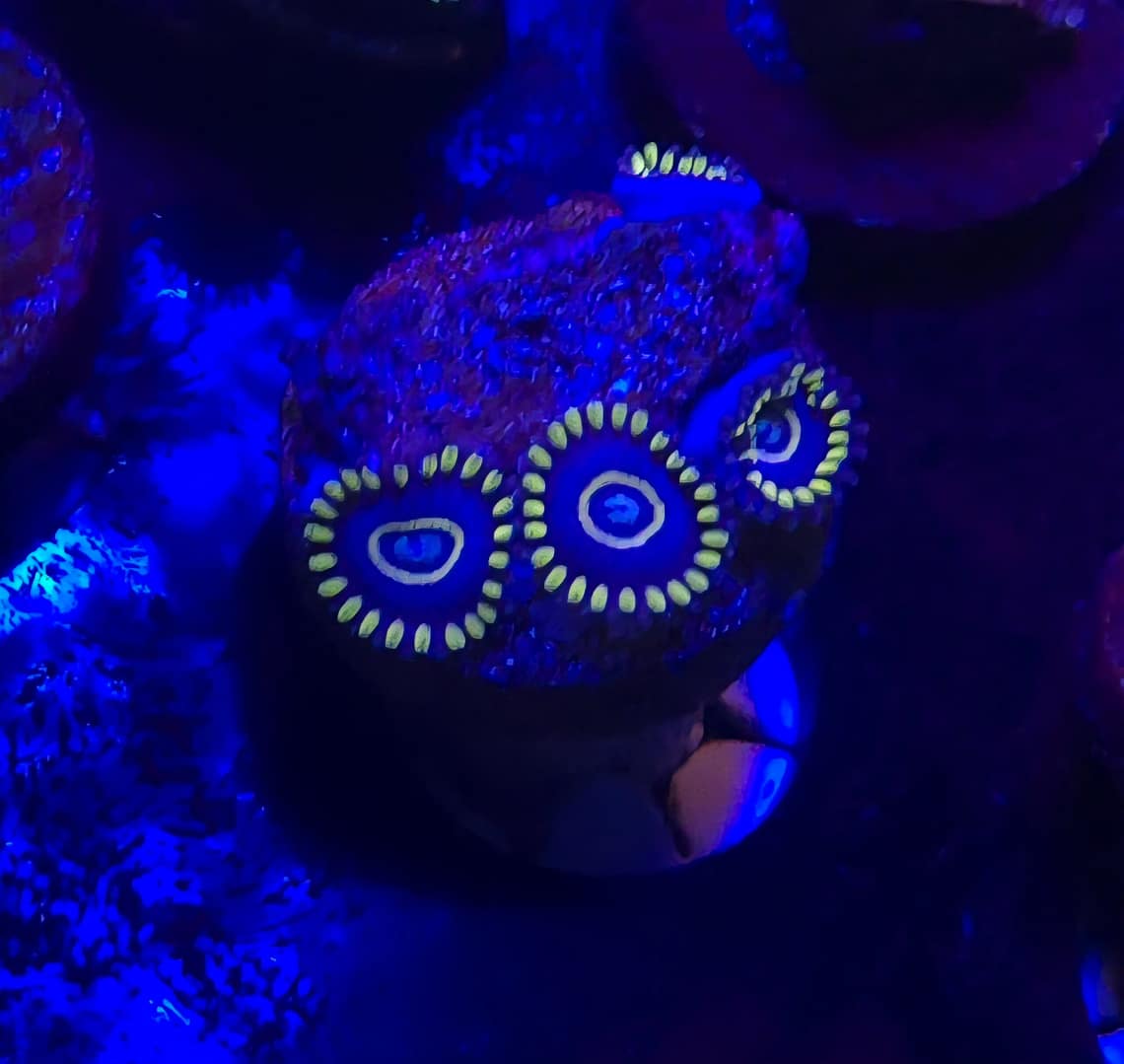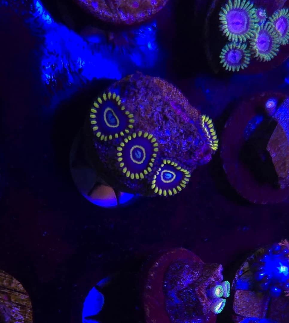 The Blue Hornet Zoanthid is one of the most famous and sought-after “Hornet” morphs in the hobby. It is characterized by its distinct, “ringed” appearance—specifically the “alternating” skirt colors that define a true Hornet. With a deep blue plate and a striking neon ring, these corals create a high-end, sophisticated look that stands out in any Zoa garden.